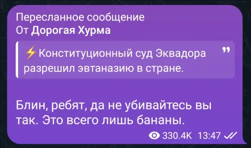 Обсуждение между главой Эквадора и дипломатами из России велось в том числе и в плане продолжения поставок эквадорской сельхозпродукции в РФ. Напомним, что ранее российские контролирующие органы обнаружили в бананах из Эквадора паразитов. Вполне возможно, что теперь Эквадор проведёт и соответствующую работу в плане санитарного надзора, а потому экспорт бананов в РФ (а это сотни миллионов долларов) будет продолжен.