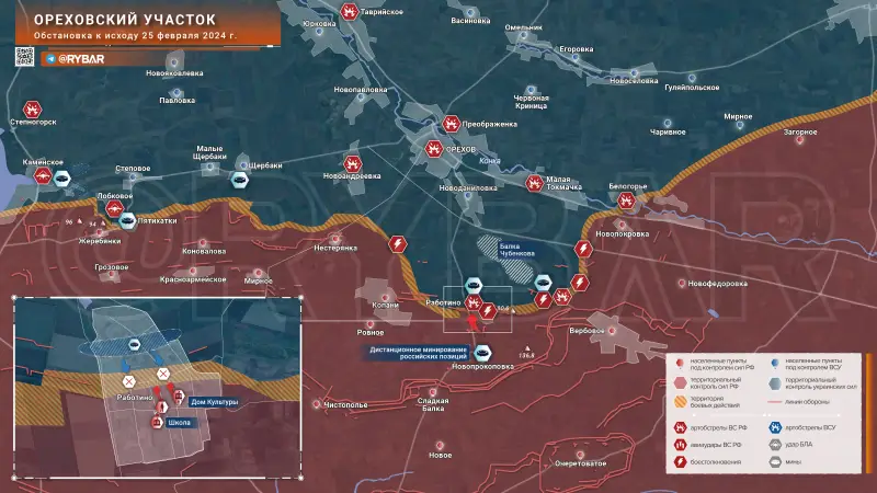 Российские войска контролируют южную часть Работино, ВСУ закрепились в северной части поселка. Сейчас бои идут за центр, появившаяся накануне информация об установлении наши контроля над центральной частью села не соответствует действительности, попытки зацепиться были, но противник нас оттуда выбил. Ситуация в Работино может меняться по несколько раз за день, бои идут ожесточенные.