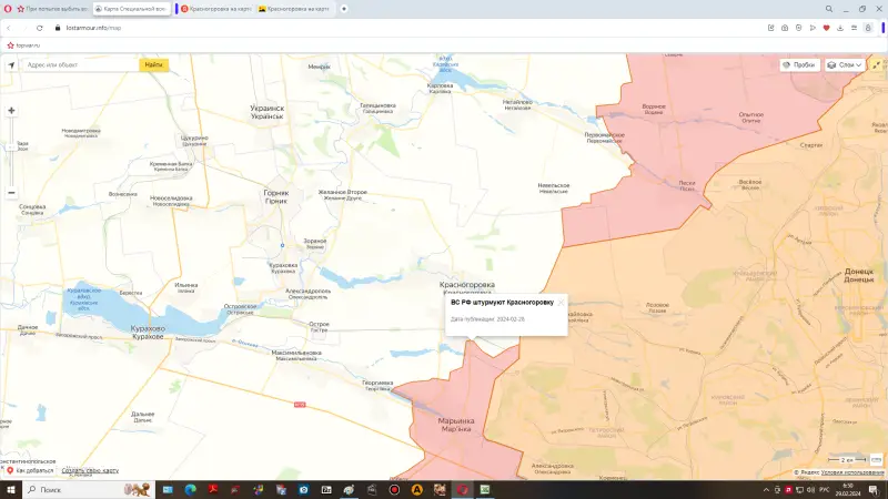 Российские войска продолжают наступательную операцию к западу и северо-западу от ранее освобождённой Авдеевки. Накануне Вооружённые силы России освободили два населённых пункта – Орловку и Тоненькое, входившие в так называемую вторую линию обороны противника западнее упомянутого города. Наступательные действия идут и на Марьинско-Кураховском направлению.