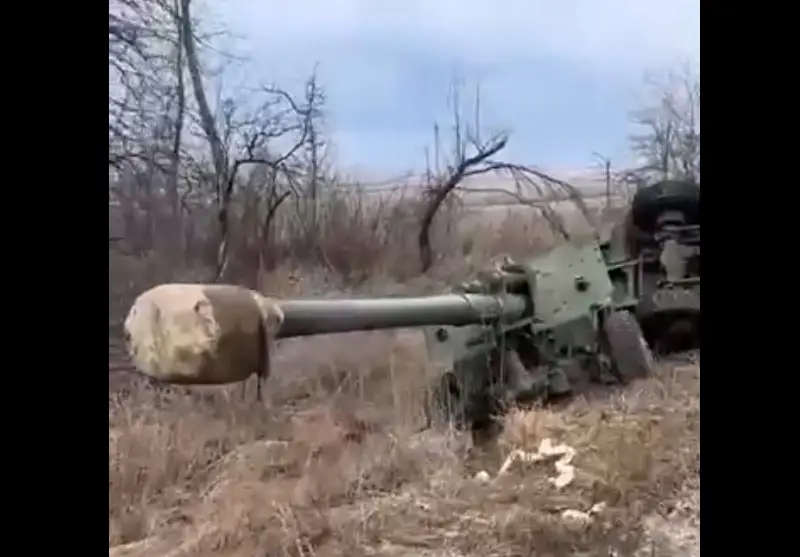 В частности, на кадрах можно увидеть уничтоженный бронеавтомобиль с нанесенными характерными украинскими опознавательными знаками, напоминающими так называемые "балкенкройцы" вермахта времен Второй мировой войны, а также перевернутый тягач, буксировавший гаубицу.