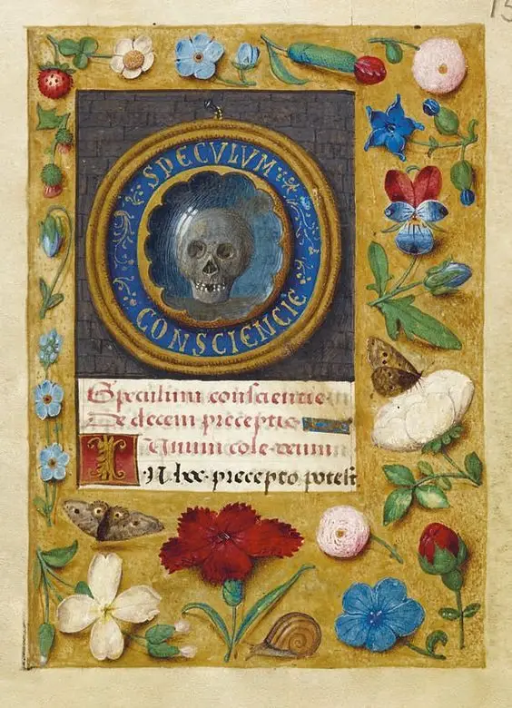 Череп в зеркале и порхающие вокруг него бабочки. Миниатюра из часослова королевы Хуаны Безумной (1486–1506). Британская Библиотека