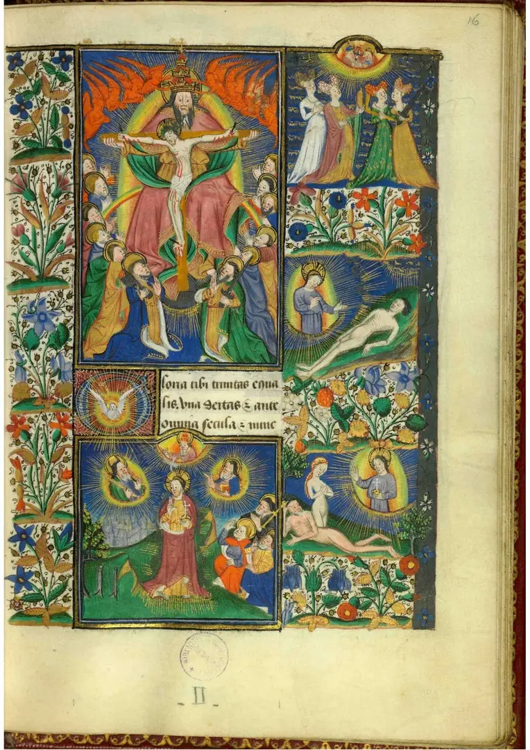 Так, в правом верхнем углу, в вечности Бога до сотворения мира, проходят дебаты о четырех кардинальных добродетелях (Благоразумии, Умеренности, Стойкости духа и Справедливости, представленных женщинами в высоких головных уборах) по случаю сотворения мира и человека. При этом обсуждение происходит в присутствии «Троицы Псалтири» (то есть Бога Отца и Бога Сына, сидящих бок о бок, здесь повернутых друг к другу, с Голубем между ними, который есть Дух Святой).