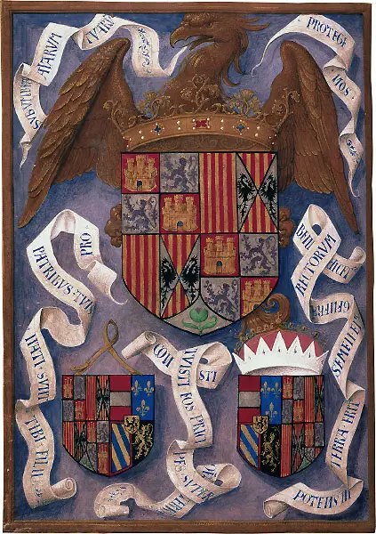 Требник королевы Изабеллы I: гербы католических монархов и брачные гербы ее детей