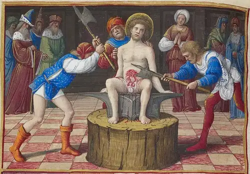 Жан Пуайе «Мученичество святого Адриана» (фрагмент). Миниатюра из Часослова Генриха VIII. Библиотека и музей Моргана, Нью-Йорк