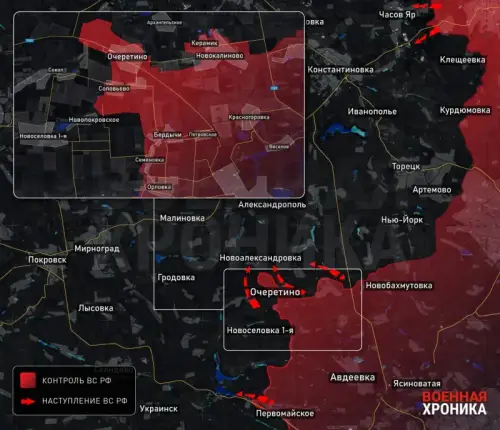 После освобождения российской армией населенного пункта Очеретино, расположенного на одной из господствующих высот к северу от Авдеевки, ВСУ, несмотря на попытки контратаковать, не удалось стабилизировать линию фронта и остановить или хотя бы задержать стремительное продвижение ВС РФ в направлении Красноармейска (Покровска), являющегося одним из крупнейших городов в западной части ДНР.