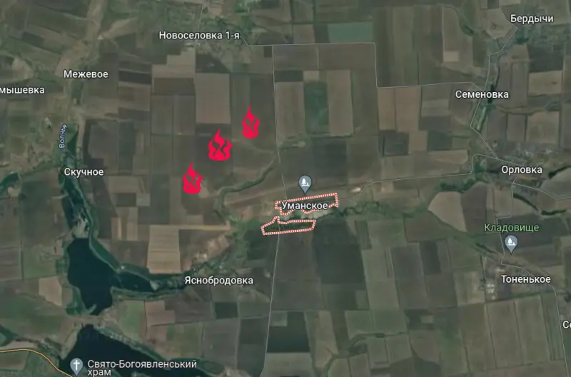 Российские войска, продолжая наступательные действия по освобождению ДНР, продвинулись к северо-западу от населённого пункта Уманское. Само это село нашими войсками было освобождено несколько дней назад.