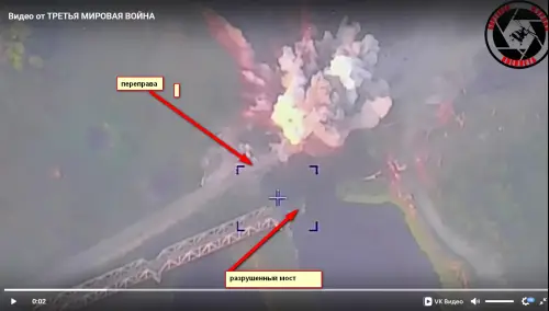 Сначала активность на наведённой ВСУ переправе через реку Оскол зафиксировал российский дрон, потом по ней ударили боеприпасом Д-30СН