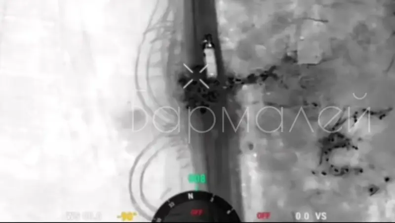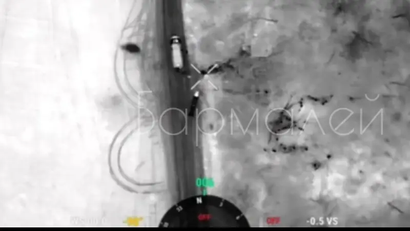 Видно, как по дороге во время ротации идут несколько бойцов ВСУ, на которых дрон сбрасывает взрывное устройство. И хотя всушники успели прыгнуть в разные стороны, одного всё же задело, и понадобилась машина эвакуации.
