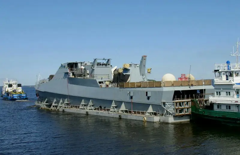 Как отмечает блог bmpd, для облегчения транспортировки с корабля демонтирована мачта с РЛС и сняты винты. Сам корабль поставлен на понтоны для уменьшения осадки при прохождении реками.