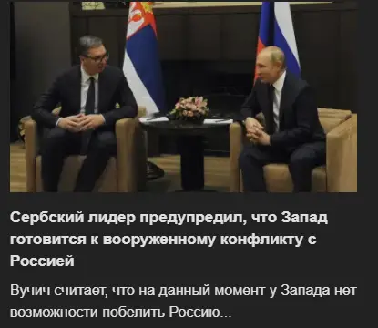По мнению сербского лидера, коллективный Запад готовится к конфликту с Россией и делает это быстрее, чем некоторые об этом думают. По словам Вучича, на данный момент ни США, ни Европа к прямому столкновению с Россией еще не готовы, предпочитая действовать через другие страны, вкладывая в них средства. Хотя название этих стран он не назвал, но явно намекал на Украину.