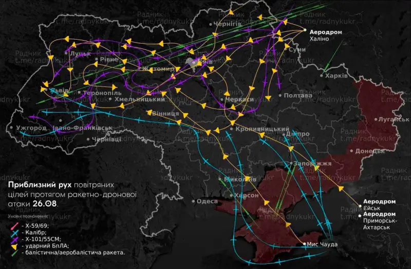 Также сообщается о поражении объектов на военном аэродроме в Черкасской области. По некоторым данным, огневое поражение с применение дронов типа «Герань» нанесено аэродрому, расположенному в районе города Золотоноша.