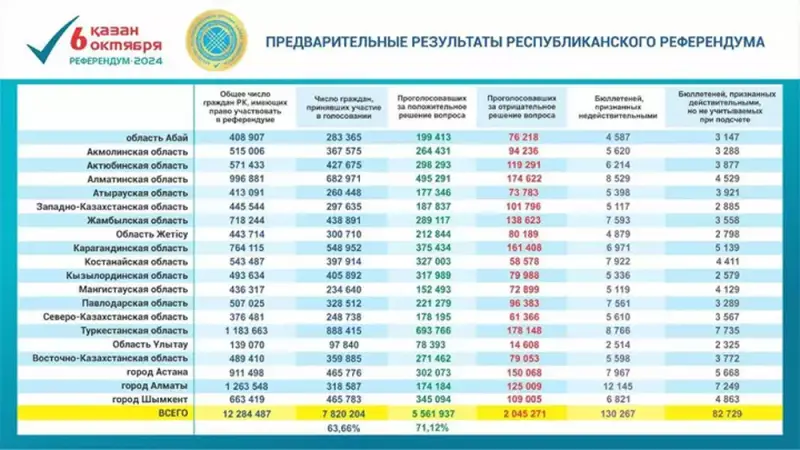 Председатель казахстанского ЦИК Нурлан Абдиров в ходе проведённого брифинга сообщил о том, что явка составила около 63,6%. Свои голоса отдали более 7,8 млн избирателей из 12,2 млн имеющих право голоса. За строительство в Республике Казахстан атомной электростанции высказались около 71,1% принявших участие в голосовании. Против – около 28 процентов.