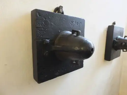 А эта бомба XIX века была поднята со дна реки с броненосца северян «Каир» 12 декабря 1964 года. Калибр снаряда 8 дюймов, то есть 203 мм. Его пришлось распилить пополам, чтобы извлечь окаменевший порох. По своему внутреннему устройству бомба относится к типу «снарядов с приливом», то есть со стенками разной толщины. Такие снаряды были выгодны тем, что в полете более тяжелой частью обращались вперед и за счет её повышенной прочности не раскалывались от удара до взрыва. Также это было выгодно тем, что в прилив ввинчивалась или вставлялась запальная трубка. Если бы прилив был с противоположной стороны, то при сильном ударе трубку могло выбить из корпуса без подрыва заряда. Ну а так она непременно поджигала бы заряд! Музей броненосца «Каир», парк города Виксбург.