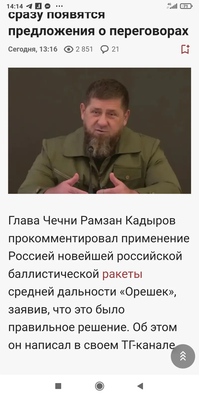 Глава Чечни Рамзан Кадыров прокомментировал применение Россией новейшей российской баллистической ракеты средней дальности «Орешник», заявив, что это было правильное решение. Об этом он написал в своем ТГ-канале.