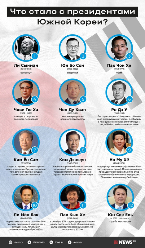 Напомним, что в начале декабря Юн Сок Ёль ввел в Южной Корее военное положение из-за конфликта с оппозиционными партиями в парламенте. Однако парламент смог отменить указ президента и объявил ему импичмент, сумев отстранить от власти со второй попытки. На данный момент Юна обвиняют в государственной измене.