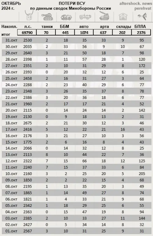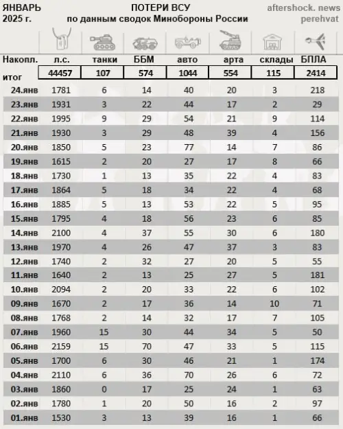 В военном ведомстве отмечают также работу расчетов противовоздушной обороны, которые за сутки сбили три реактивных снаряда системы залпового огня HIMARS производства США и 44 беспилотных летательных аппарата самолетного типа.