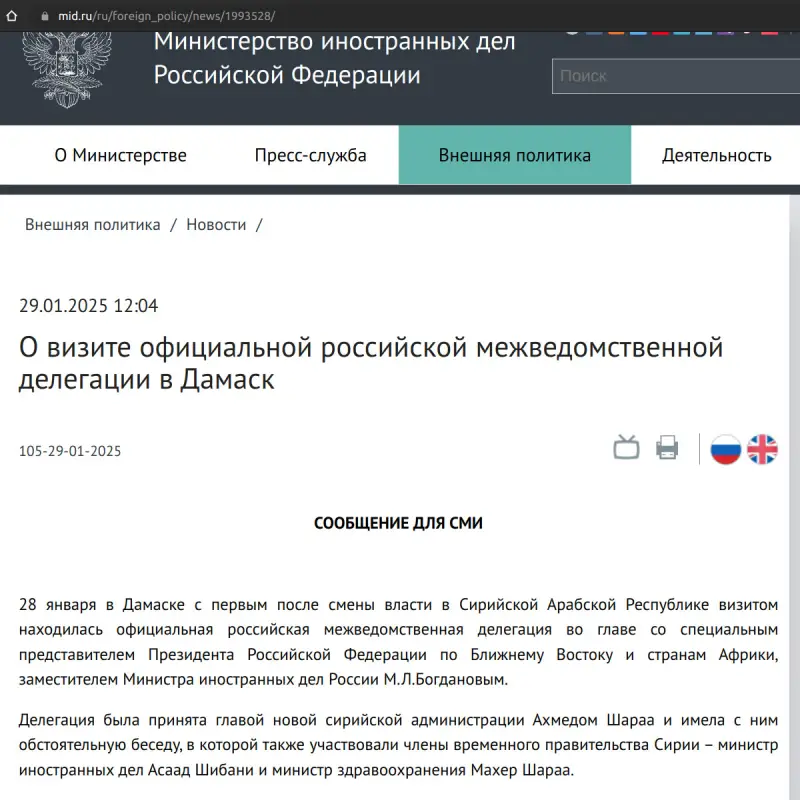 В частности, до сих пор не находит решения вопрос с нашими военными базами в Тартусе и Латакии. Ранее сообщалось, что российская делегация, накануне впервые прибывшая в Сирию после отставки Асада, поднимала данный вопрос на переговорах. Но стороны пока не пришли к консенсусу.