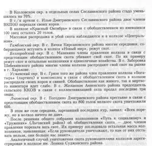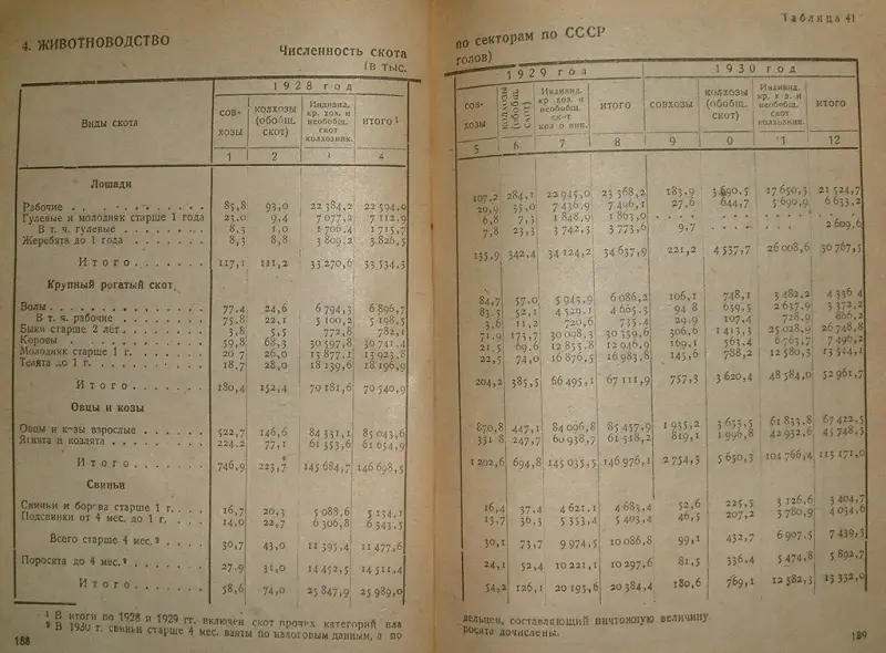 В итоге за четыре года энергичной реализации сталинского плана переустройства сельского хозяйства (1928-1932) численность скота в СССР уменьшилась по рабочим лошадям — на 4,7 млн голов / 20,9 %, крупному рогатому скоту — на 27 млн голов / 38,З %, из них коров на 7,7 млн голов / 24,9 %, молодняка и волов — на 19,6 млн / 4,9 %, овец — на 82 млн голов / 61,7 %, и свиней на 11,5 млн голов / 44,1 %.