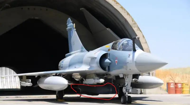 Архивное фото самолёта Mirage 2000-5 ВВС Греции, полностью вооружённого ракетами Mica IR, Mica EM и Storm Shadow/SCALP, перед его укреплённым укрытием для самолётов