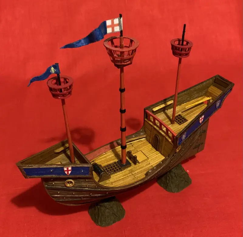 Щитов по бортам с крестами Св. Георга и французскими королевскими лилиями установлено ровно столько, сколько их изображено на печати. Вымпелы из ткани, а изображения на них – это термодекали из местной типографии, и переведены на них давлением горячего утюга. Потом ткань была пропитана суперклеем, а сами вымпелы высушены так, как если бы их трепал морской бриз.