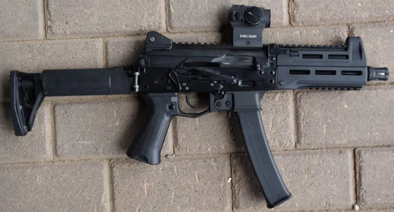 Конструкция включает складной приклад из прочного полимера, который складывается в сторону ствольной коробки, что делает его удобным для транспортировки и использования в ограниченном пространстве.