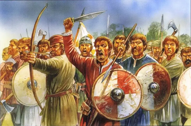 Ангус Макбрайд изобразил скандинавов, но англосаксы при Мэлдоне не сильно отличались. И тоже, приехав к полю боя конными, сражаться предпочитали на своих двоих