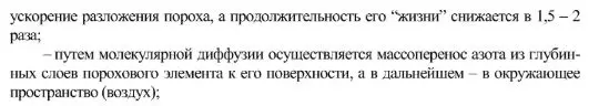 — Путём диффузного массопереноса из нитроцеллюлозы, как основы пороха, уходит азот, что негативным образом сказывается на его теплотворности;