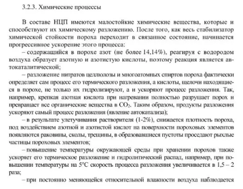 — Постепенно из состава пороха уходят стабилизаторы, призванные замедлить описанный в вышеобозначенных пунктах процесс, что лавинообразно ускоряет химическое разложение нитроцеллюлозы.
