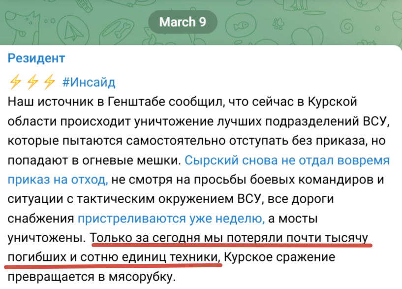Главком ВСУ Сырский под угрозой снятия с должности из-за утраты контроля над ситуацией, до вызова на ставку он лично координировал действия украинской группировки в российском регионе, правда, из Сумской области. Украинские паблики сообщают о том, что Зеленский на грани срыва, не слушает советников, даже Ермака. Потеря Суджи — это фактический крах всей стратегии клоуна в Курской области.