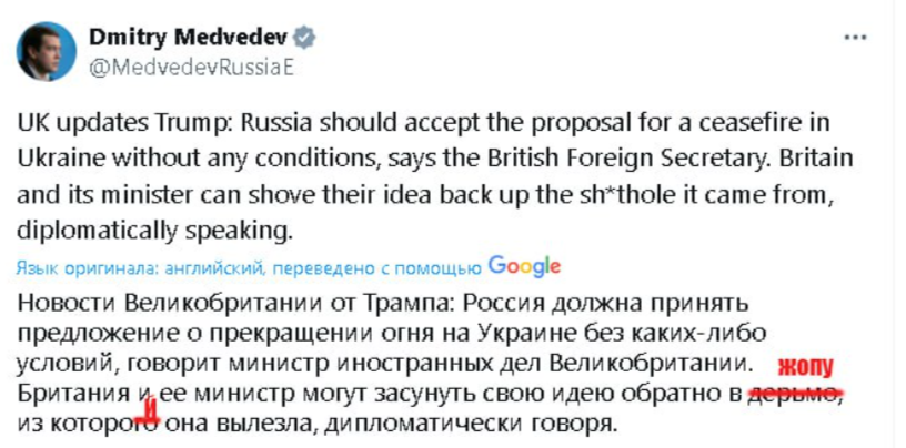 Медведев прокомментировал призыв Макрона и Лэмми к России принять предложение по 30-дневному перемирию без всяких условий
