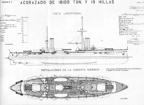 Предложенный «Виккерсом» эскизный проект представлял собой дредноут водоизмещением 16100 тонн («Андрей Первозванный» планировали построить 16500-тонным!) со скоростью 19 узлов с 8х12'' орудиями: в двух трёхорудийных и одной двухорудийной башнях. Второй проект представлял собой итальянскую переработку проекта «Виккерса»: те же 8х12'' орудий, но в четырёх двухорудийных башнях. Смета, выставленная представителю испанского флота капитану 1 ранга Фустеру, составила 1490 тыс. фунтов стерлингов (в смету входила и стоимость боеприпасов). Поскольку испанское правительство было готово потратить на строительство кораблей 1607 тыс. фунтов стерлингов, прошёл проект общества SECN: очень сильно напоминающий «виккерсовский», но с небольшими изменениями. Цена корабля, согласно ему, составила 1708 тыс. фунтов стерлингов. Проект утвердили королевским декретом от 14 апреля 1909 года.