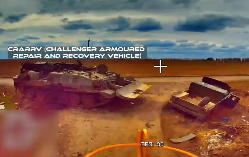 В сети показаны кадры уничтожения довольно редкой бронетехники украинских оккупантов в Суджанском районе Курской области. Речь идет о британской БРЭМ Challenger Armoured Repair and Recovery Vehicle (CRARRV), предназначенной для эвакуации и полевого ремонта танков Challenger 2, и американской транспортно-заряжающая машине M992 Field Artillery Ammunition Support Vehicle vehicle (FAASV) для САУ M109.