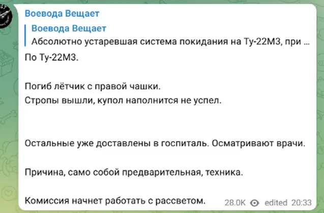 Ту-22М3 - дальний сверхзвуковой ракетоносец-бомбардировщик, производившийся с 1970-х годов по 1993-й. Способен нести на борту ядерное оружие. Каждый член экипажа снабжён катапультным креслом. Катапультирование осуществляется в последовательности: оператор, штурман, правый лётчик, командир.
