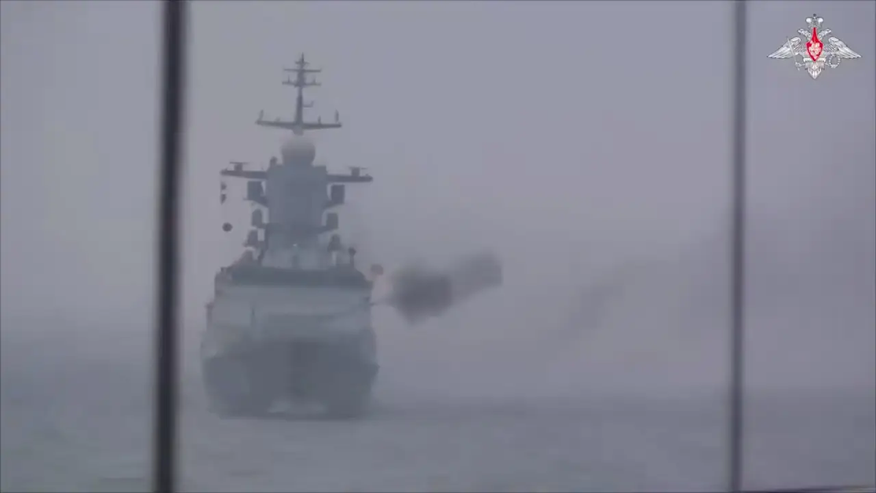Корвет Балтфлота ведёт огонь из 100-мм орудия, кадр из видео Миноборбоны РФ
