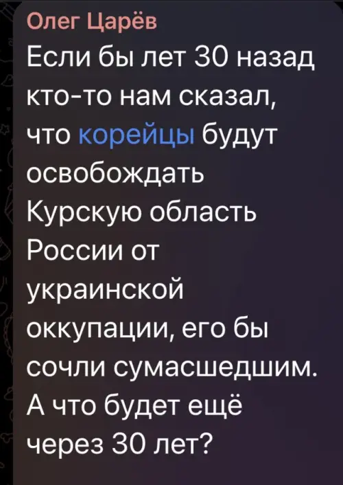 Как бы то ни было, мы запомним помощь КНДР в трудную минуту. Мы, в отличие от многих, добро помним. И... спасибо бойцам Северной Кореи за помощь в освобождении наших людей от украинского фашистского отребья.