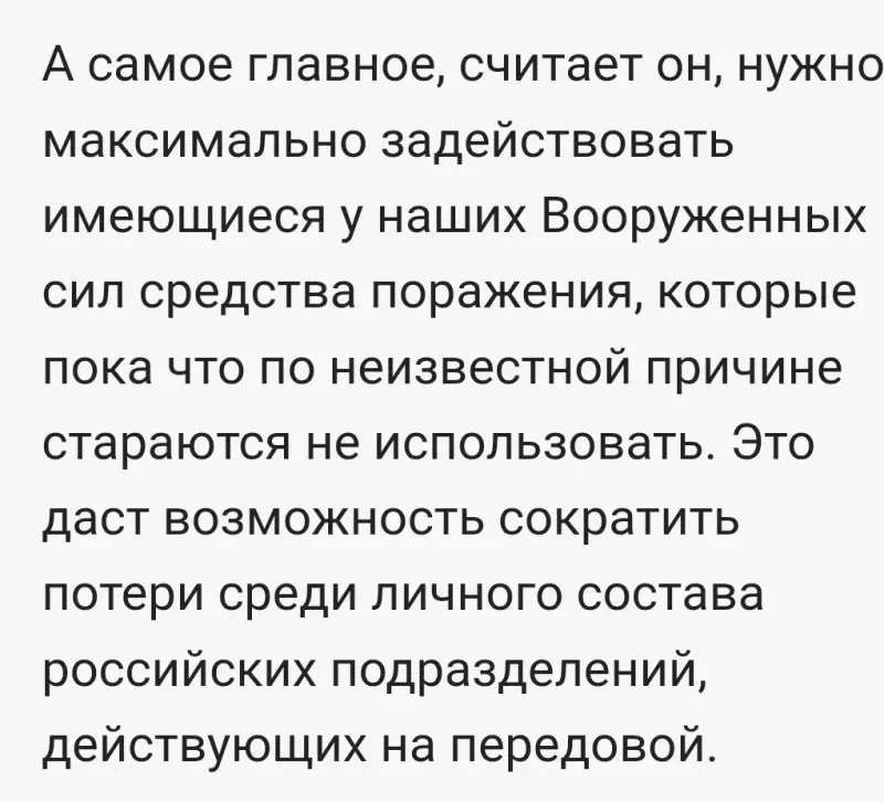 А самое главное, считает он, нужно максимально задействовать имеющиеся у наших Вооруженных сил средства поражения, которые пока что по неизвестной причине стараются не использовать. Это даст возможность сократить потери среди личного состава российских подразделений, действующих на передовой.