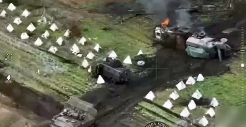 Однако в украинском Генштабе, а скорее на Банковой, не угомонились. Сообщается, что сегодня утром всушники в составе механизированной колонны фактически полезли напролом в Глушковский район Курской области, дабы высадить пехоту. Причем место, как и время, для прорыва выбрали довольно странное — днем через несколько рядов тетраэдров (бетонные заграждения против бронетехники, их еще называют «зубы дракона»).