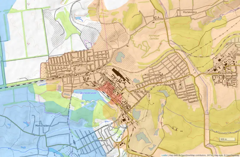 Части Часова Яра, где в той или иной степени присутствуют украинские войска, помечены на фрагменте карты:
