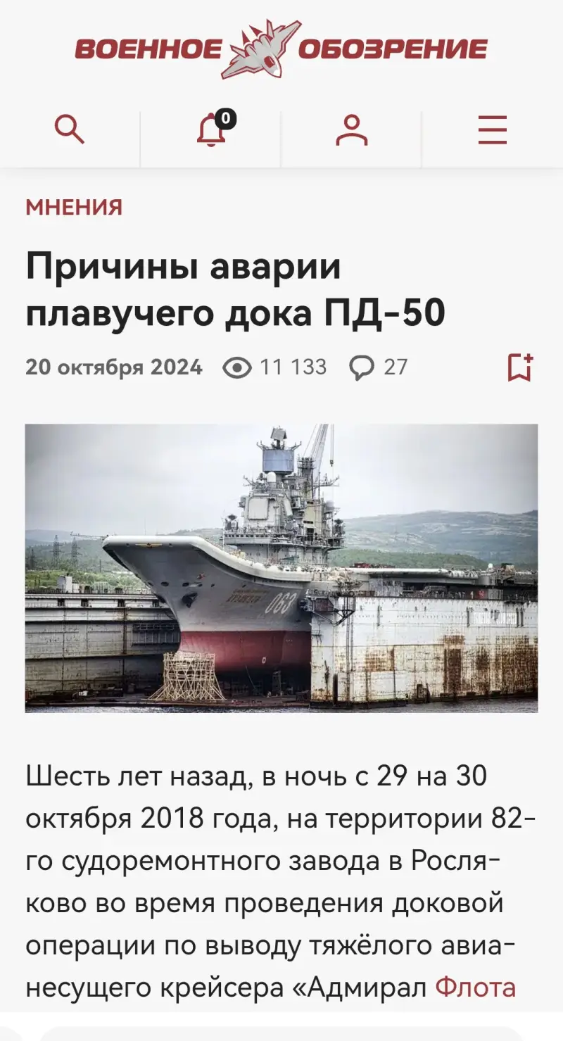 Стоит отметить, что с 2018 года попытки поднять затонувший плавдок предпринимались неоднократно. По крайней мере, обещания с заверениями о начале работ по подъему звучали несколько раз. Однако плавдок так и остался на дне. Напомним, что ПД-50 затонул 30 октября 2018 года при выводе из него тяжелого авианесущего крейсера «Адмирал Кузнецов».