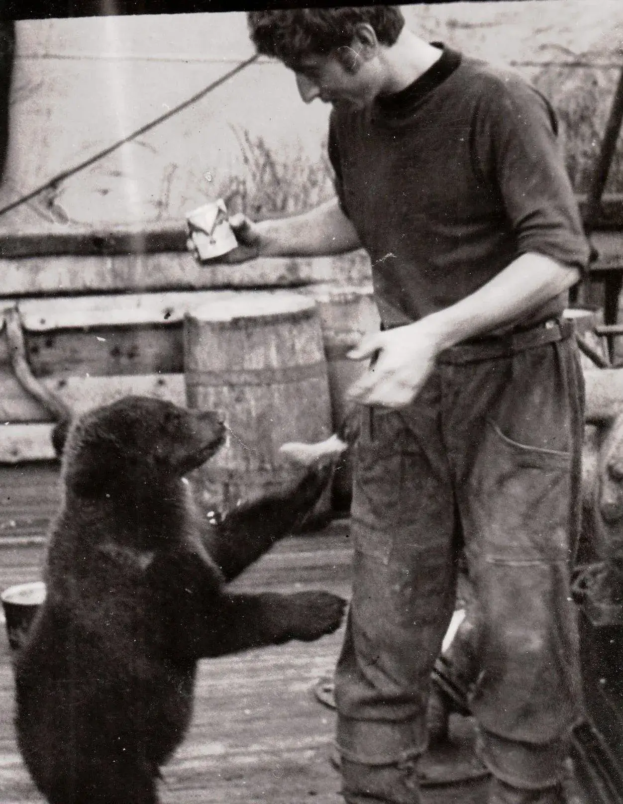 Работа на промысле была тяжелая, но интересная. Ботовые ходили к берегу на охоту, добывали горных козлов, медведей и однажды добыли лося, так что свежее мясо у нас было. По весне привозили с берега полные корзины черемши и лука — всё съедалось влёт. В конце июня появилась талая вода на льдинах, и мы запасались пресняком. В Аяне, Инюхе ходили в «гастроном», меняя шкурки на курево и спиртное. И на другой день все были как штык — сказывалась закалка! Был на «Лахтаке» медвежонок Яшка, ботовые привезли с берега…. Поначалу он скучал, потом прижился и был любимцем команды. К осени он подрос, и его отдали в цирк во Владивостоке…