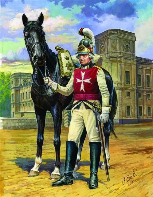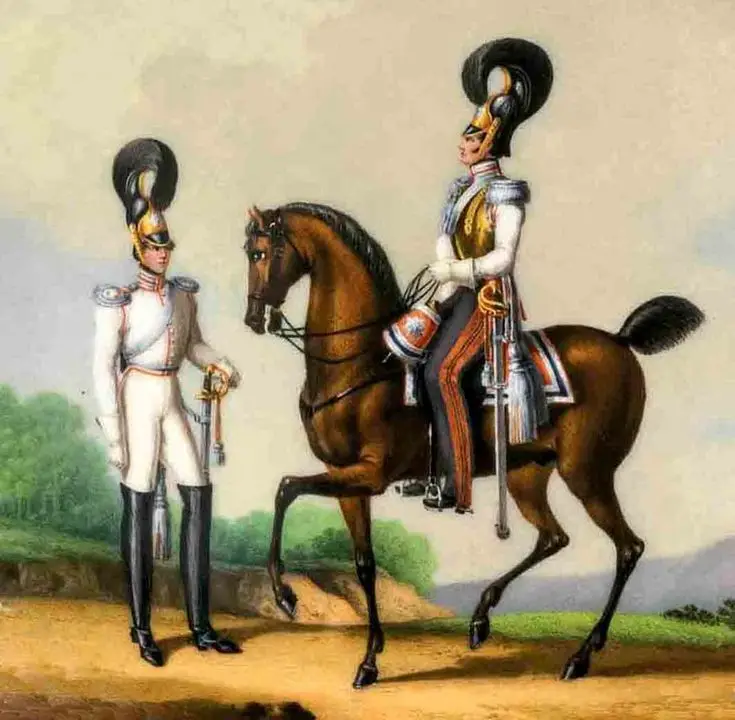 Конная гвардия — кавалергарды — носила белые колеты (даже у кирасир тогда кирасы почему-то отобрали), высокие каски из черной кожи с чеканным налобником со звездой и небольшим гребнем, который, однако, украшала пышная волосяная «гусеница».