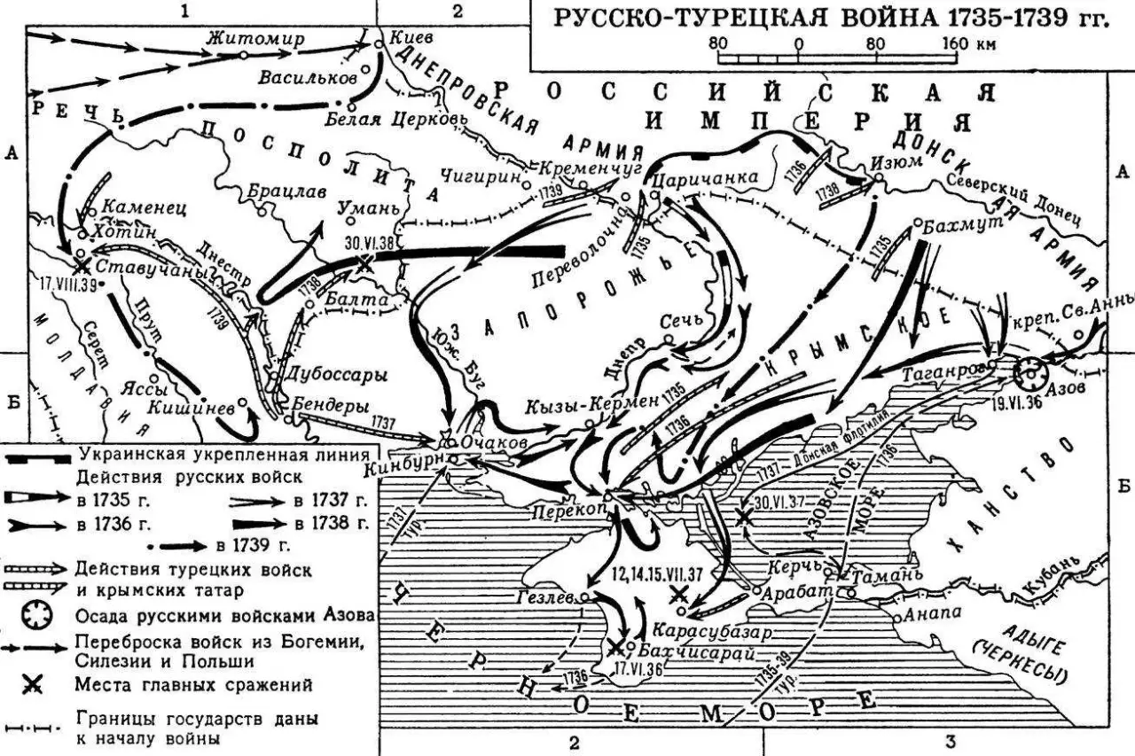 Во-вторых, «плачевная», как её назвал русский военный историк А. Керсновский, стратегия России в ходе всех четырёх кампаний 1735–1738 гг. Каждая кампания повторяла ошибки предыдущей и ошибки ещё допетровских походов князя Голицына к Перекопу. Огромная громоздкая армия, связанная колоссальными обозами и артиллерийскими парками, просто не могла эффективно действовать. Её вполне мог заменить легкий «летучий» корпус из драгун с конной артиллерией, чтобы останавливать степняков. Чтобы быстро форсировать Дикое поле и захватывать ресурсы противника (скот, лошадей).