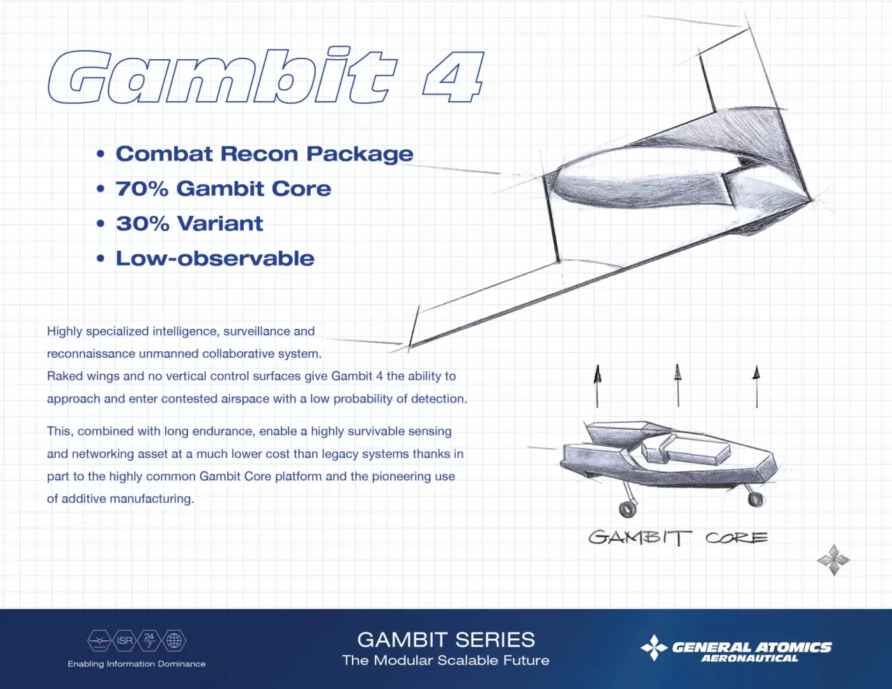 В 2024 г. GA-ASI впервые рассказала о своем новом проекте — семействе БПЛА разного назначения Gambit. В нем предлагалось создание платформы с набором основных средств и агрегатов, на базе которой можно было бы строить беспилотники разного облика и назначения. В рамках этого проекта рассматривалась возможность использования гибридной двигательной установки.