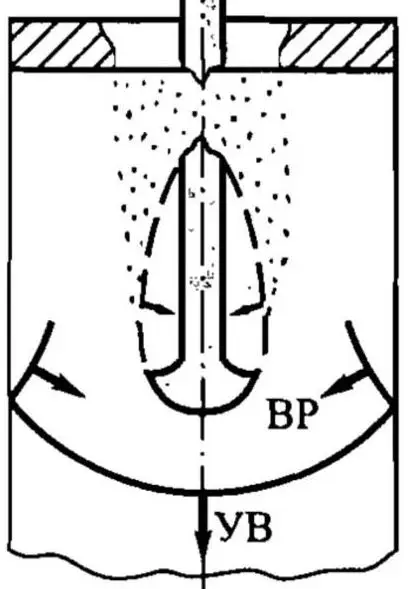 Схематичное изображение воздействия керамики на кумулятивную струю. УВ — ударная волна, ВР — волна разрежения. Источник: «Частные вопросы конечной баллистики», МГТУ им. Баумана.