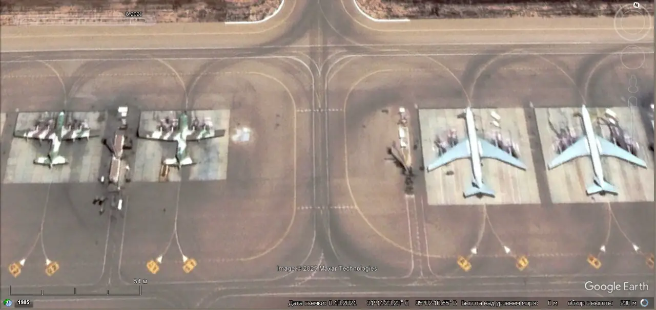 На спутниковом снимке стоянок заправщиков КС-130Н и КС-707 видно, что эти машины стоят открыто и ничем не защищены. Впрочем, построить полноценные укрытия для самолётов такого размера является делом весьма накладным даже для Израиля.