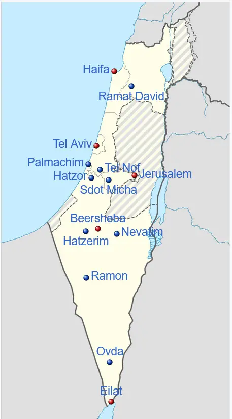 На территории Израиля имеется 10 авиабаз. Из них пять используется для базирования истребителей-бомбардировщиков и перехватчиков ПВО.