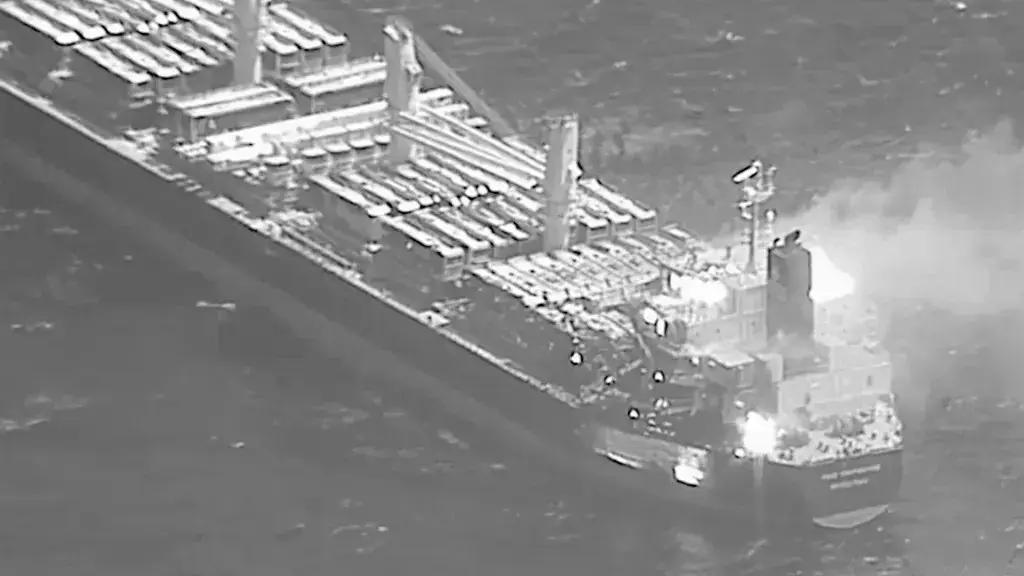 Грузовое судно True Confidence под флагом Барбадоса загорелось после попадания в него ракет хуситов в прошлом году. Снимок с дрона ВМС США