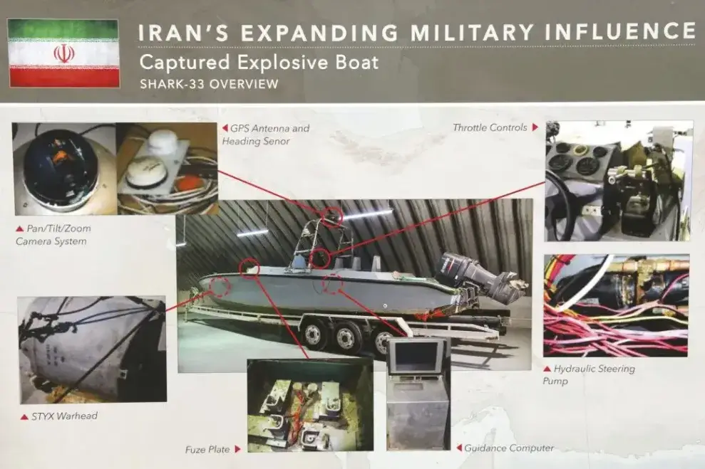 Слайд с брифинга Министерства обороны США от 2017 года, на котором показаны компоненты захваченного у хуситов беспилотного катера, известного как «Акула-33». Катер-«камикадзе» предположительно поставлен Ираном. Показана система наведения с помощью GPS и оптический датчик. Американские власти тогда заявили, что он способен отслеживать и поражать движущиеся цели.