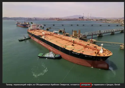Танкер, перевозящий нефть из Объединенных Арабских Эмиратов, готовится к разгрузке на терминале в Циндао, Китай.