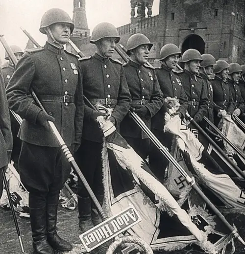 Вражеские знамена и штандарты советские воины несли в перчатках, подчеркивая то, что даже в руки древки этих символов брать омерзительно. На параде их будут бросать на специальный помост, чтобы штандарты не коснулись мостовой священной Красной площади. Первым бросят личный штандарт Гитлера, последним — знамя армии Власова (белый флаг с косым синим крестом). Позднее этот помост и перчатки сожгут.